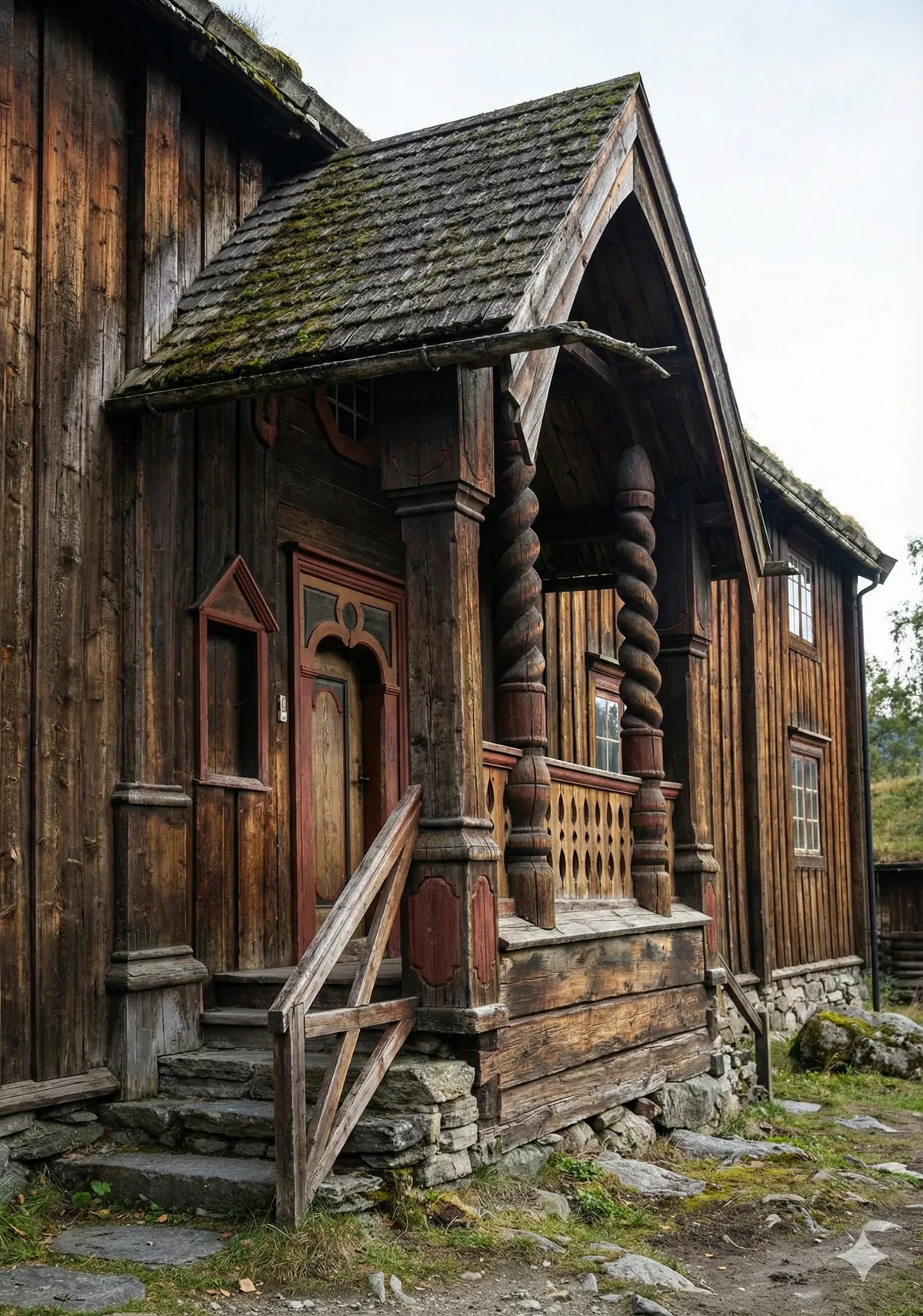 Był to dwukondygnacyjny budynek z drewna, z charakterystycznymi spiralnymi kolumnami (widocznymi na obrazie) i bogatymi zdobieniami. Wnętrza zdobiły tradycyjne norweskie malowidła ludowe (rosemålingż), które wykonał znany w Norwegii malarz, Kristen Aanstad.
